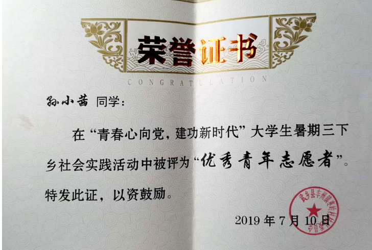 2019年“暑期三下乡”优秀青年志愿者